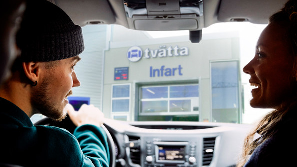 - Kör fram till porten eller stoppskylten och vänta några sekunder på att registreringsskylten ska kännas igen och kör in i tvätten.