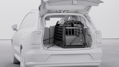 Hundburen har en unik design som gör att den är justerbar i djupled och passar flera av Volvos bilmodeller. Det finns utrymme för bagage bredvid hundburen.